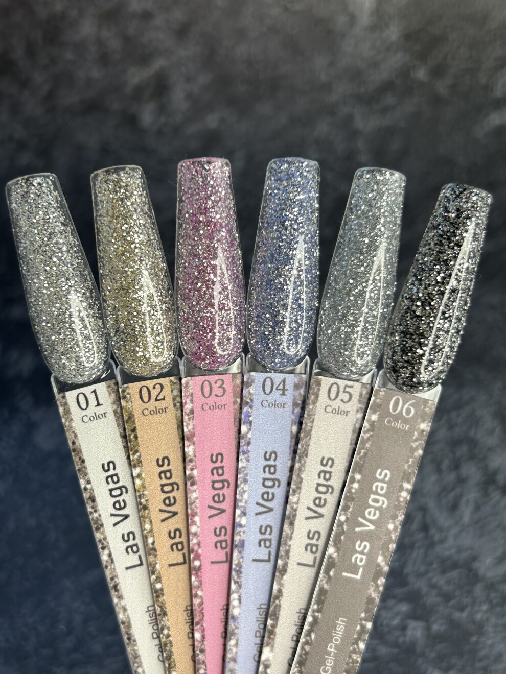 Встречайте новую коллекцию гель-лаков Las Vegas- это миллион сверкающих бриллиантов в шести цветах. Осторожно при попадании света могут ослепить.
