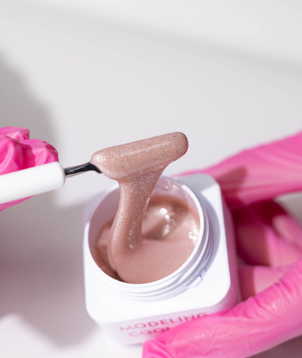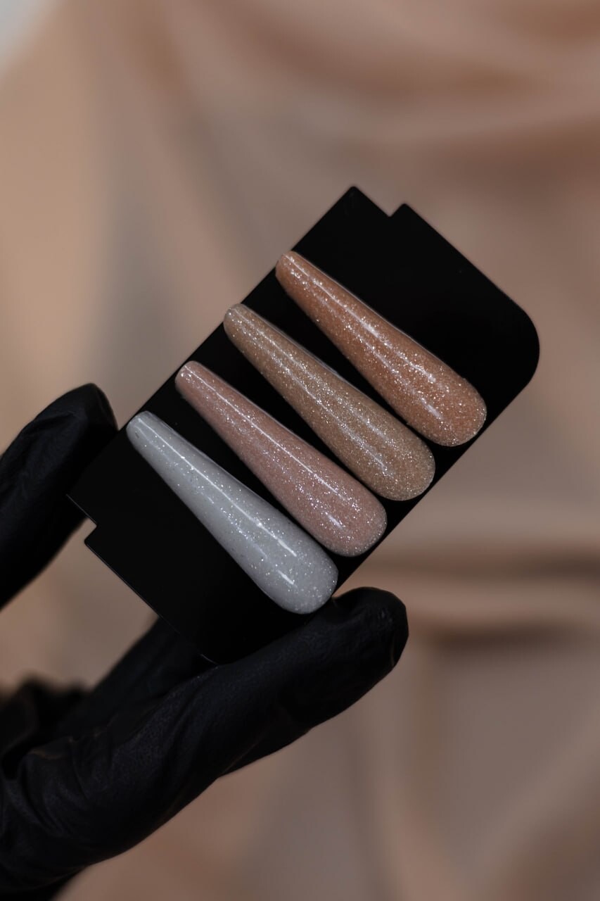 Нежные камуфлирующие оттенки с серебряным необычным шиммером придают гелю элегантную роскошь.